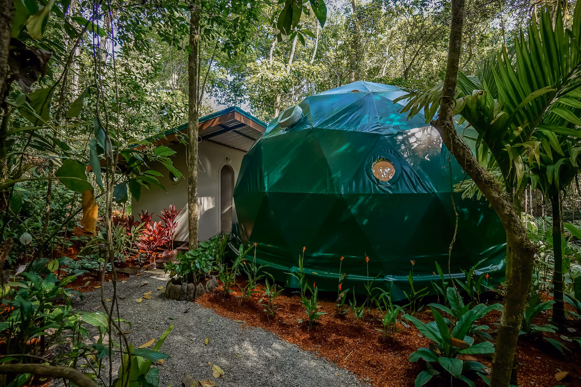 Inspired by sacred geometry, our 6 Geodesic River Domes, sits in the rainforest along the edge of our private river. Enjoy the soothing sounds of the flowing water paired with the vibrant sounds of the jungle.