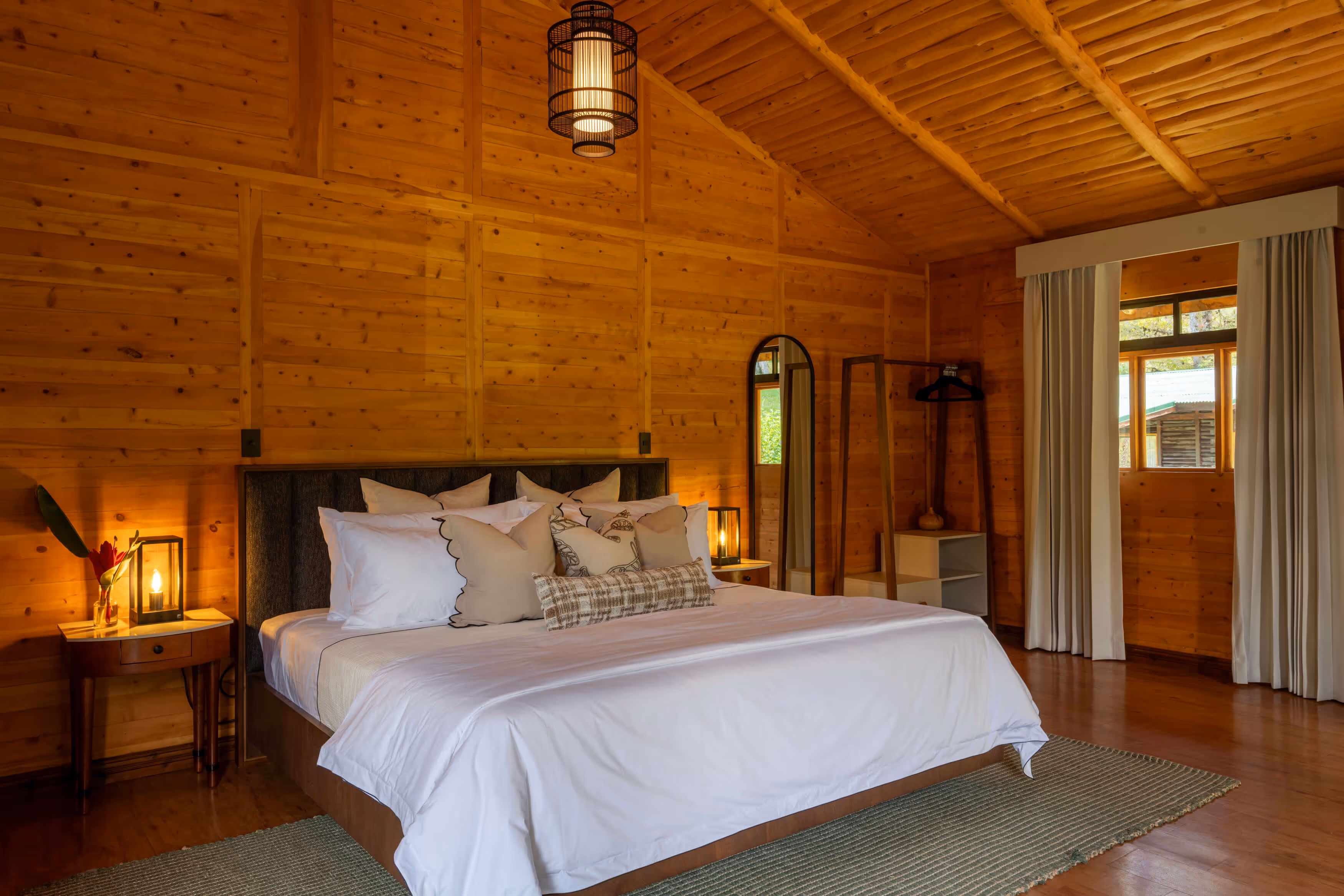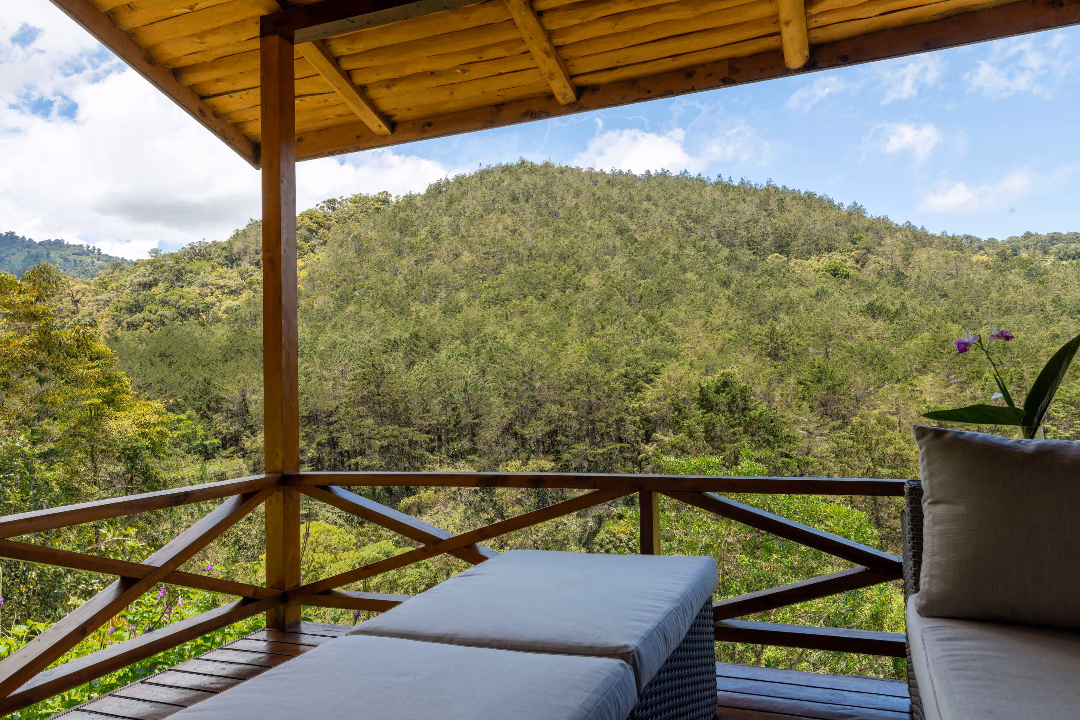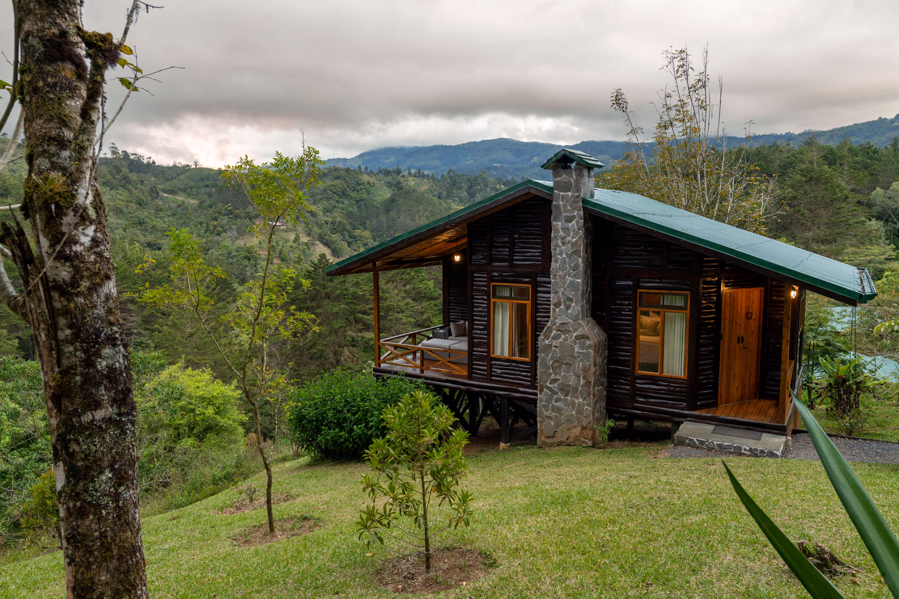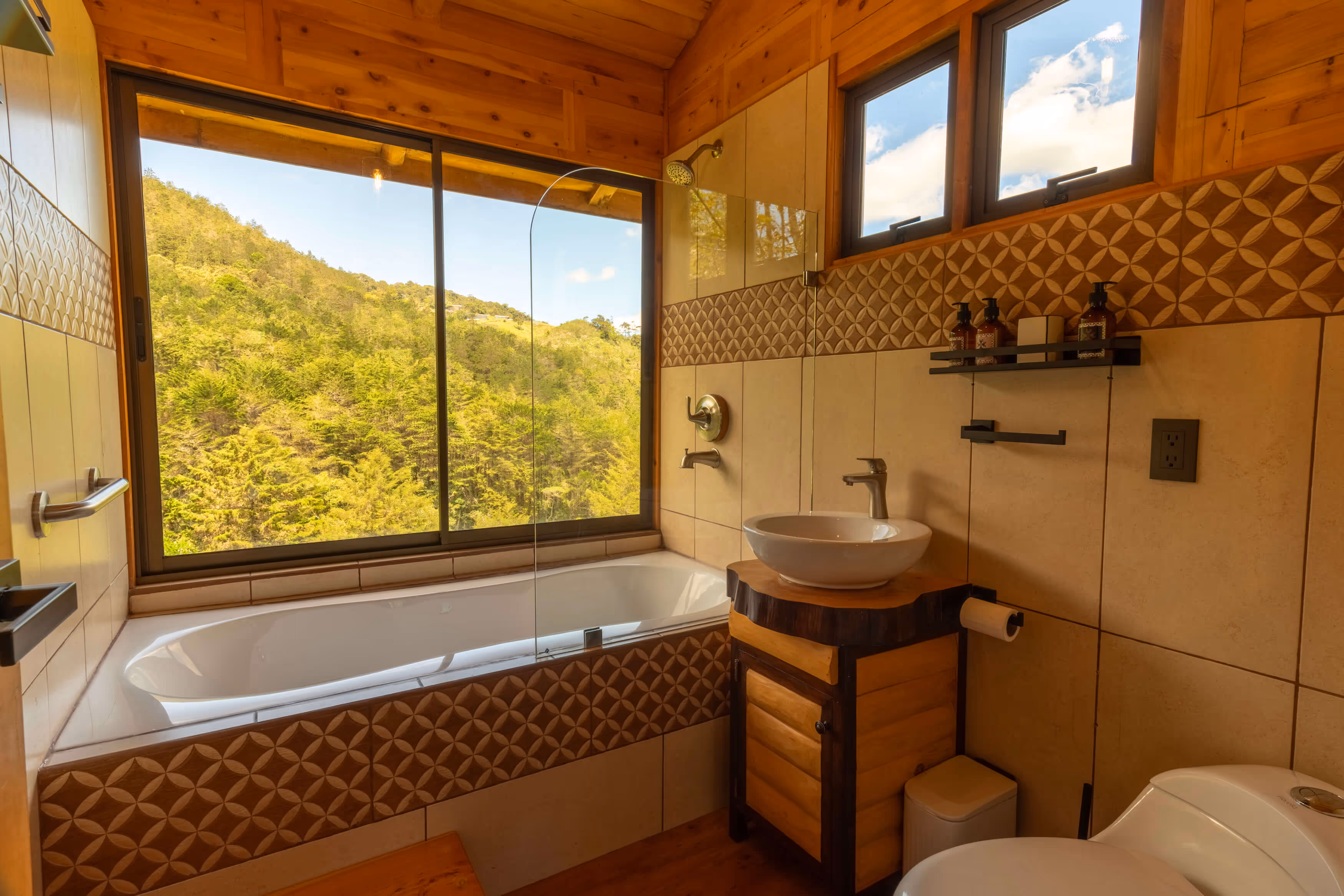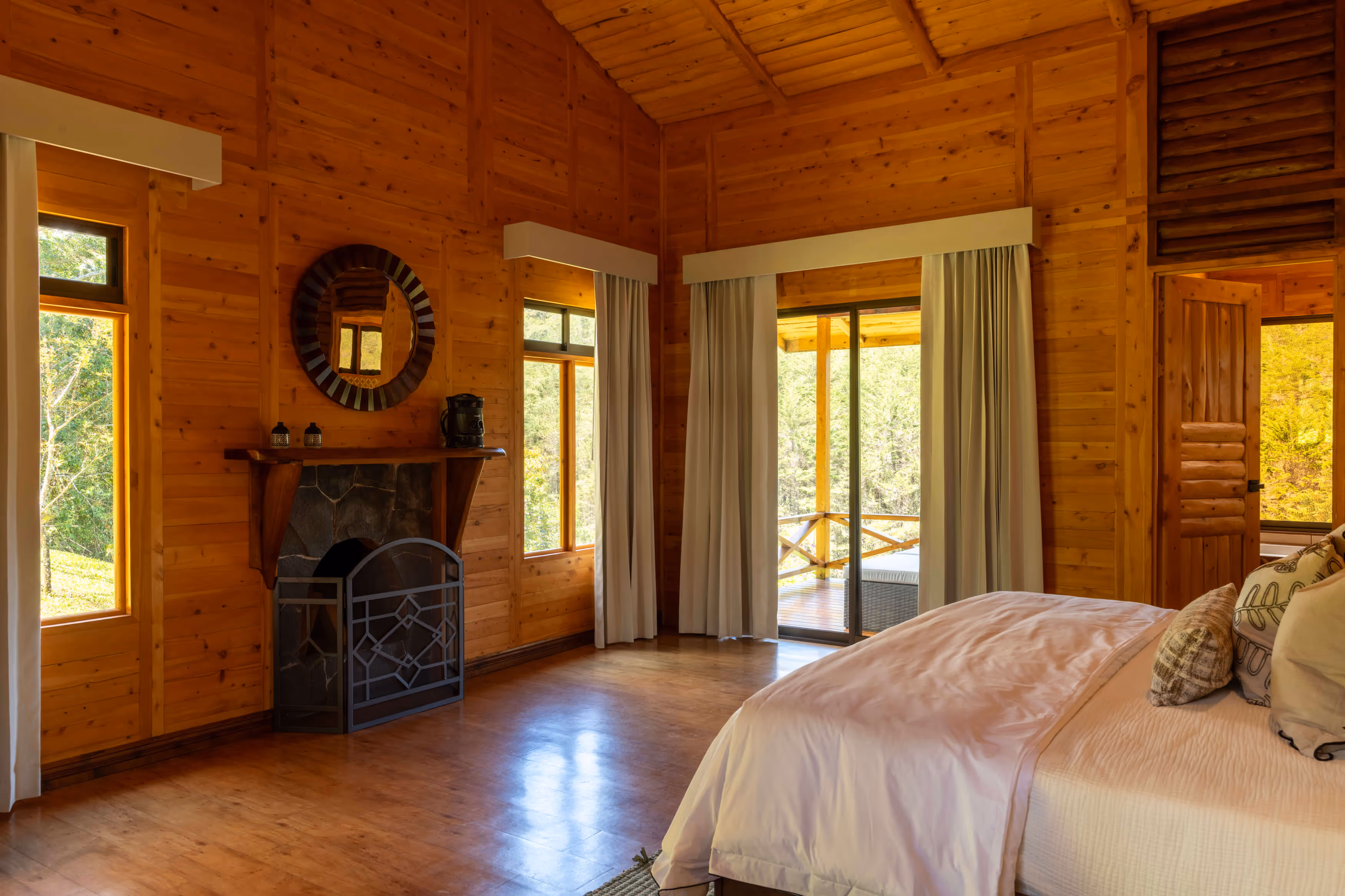 Our VIP mountain cabin is located at the top of the property featuring gorgeous views of the forest covered mountains. This cabin is spacious and secluded for extra privacy. It features 1 king sized bed a private deck, a fireplace for cozy nights as well as a soaking tub with beautiful views.